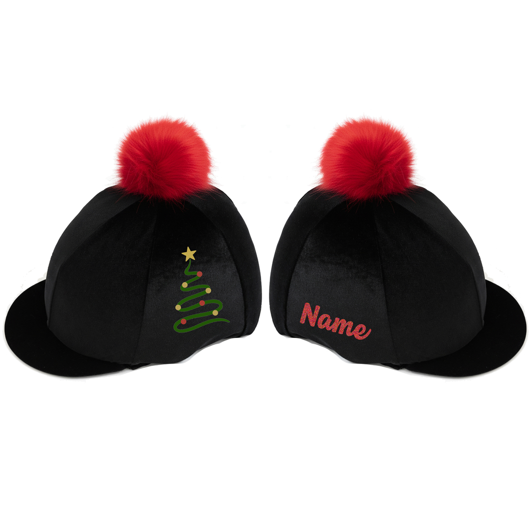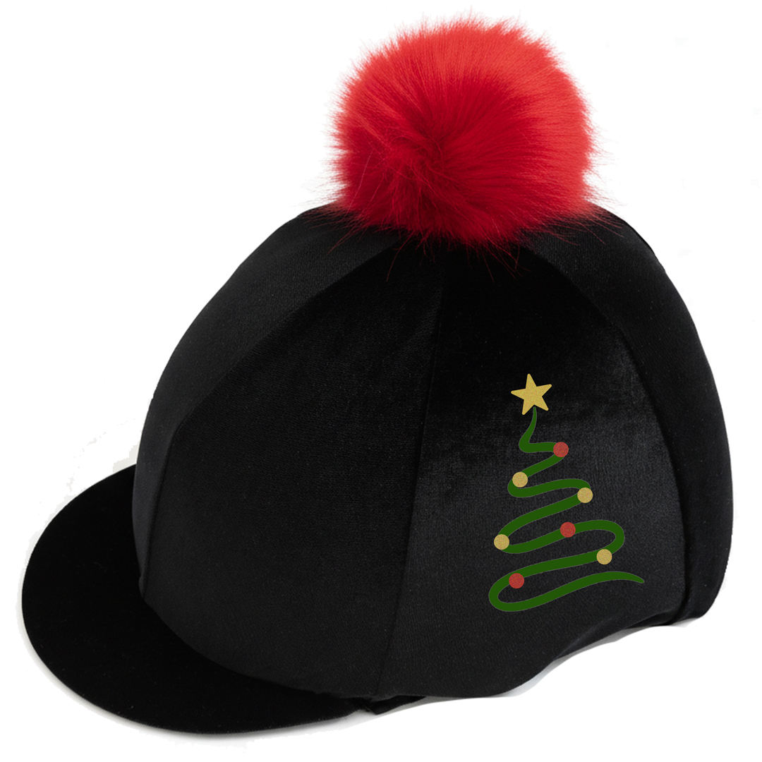 This black riding hat silk with a glittery Christmas tree design is perfect for Christmas. Very pretty and topped with a very fluffy bright red pom. The tree is printed in a bright green and topped with glittery red and gold baubles. Stretchy riding hat cover will fit any size riding hat. If your hat has a peak already, then order a pocket cover, this will slide nicely over the peak. If your hat is a skull design then order the cover with a fixed peak. Please refer to the photo of the two riding hats to ensure you order the correct style cover.