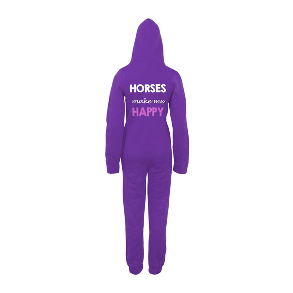 ‘Horses Make Me Happy’ our popular design, has now been added to our warm and cosy onesies. ‘Happy’ is printed in gorgeous glitter. Imagine a head to toe hoodie! They are lovely and fleecy on the inside and really cosy to wear. If you’d like it personalised, we’ll put the name right across the top.