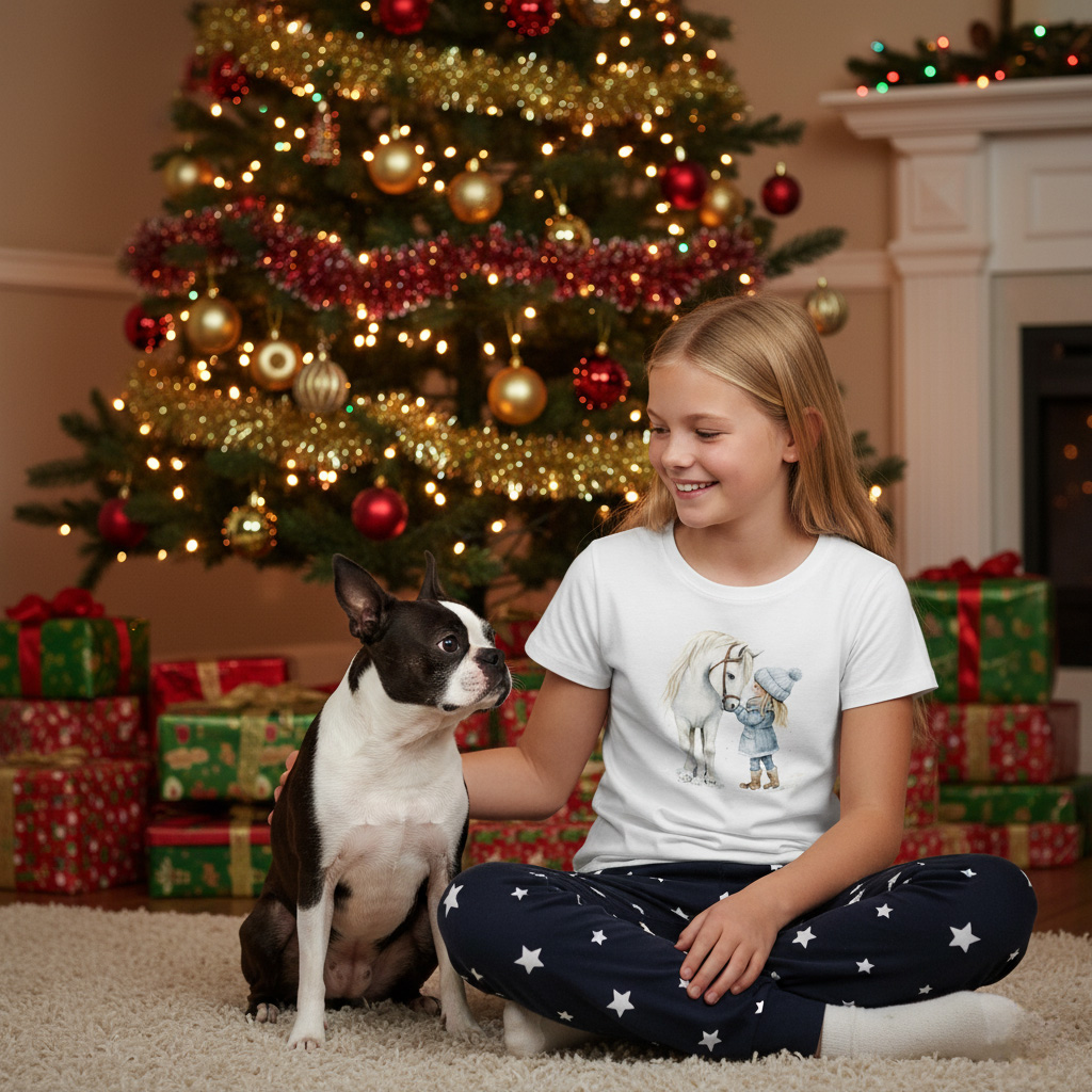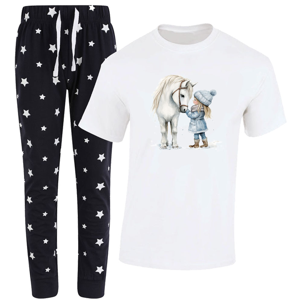 This fun pyjama set is perfect for a pony loving child this Christmas. If you would like them personalised, I can add any name you like across the back in navy. The trousers are very soft with an elasticated waist band and are made from 96% cotton and 4% elastane. The t-shirt top is 100% cotton.
